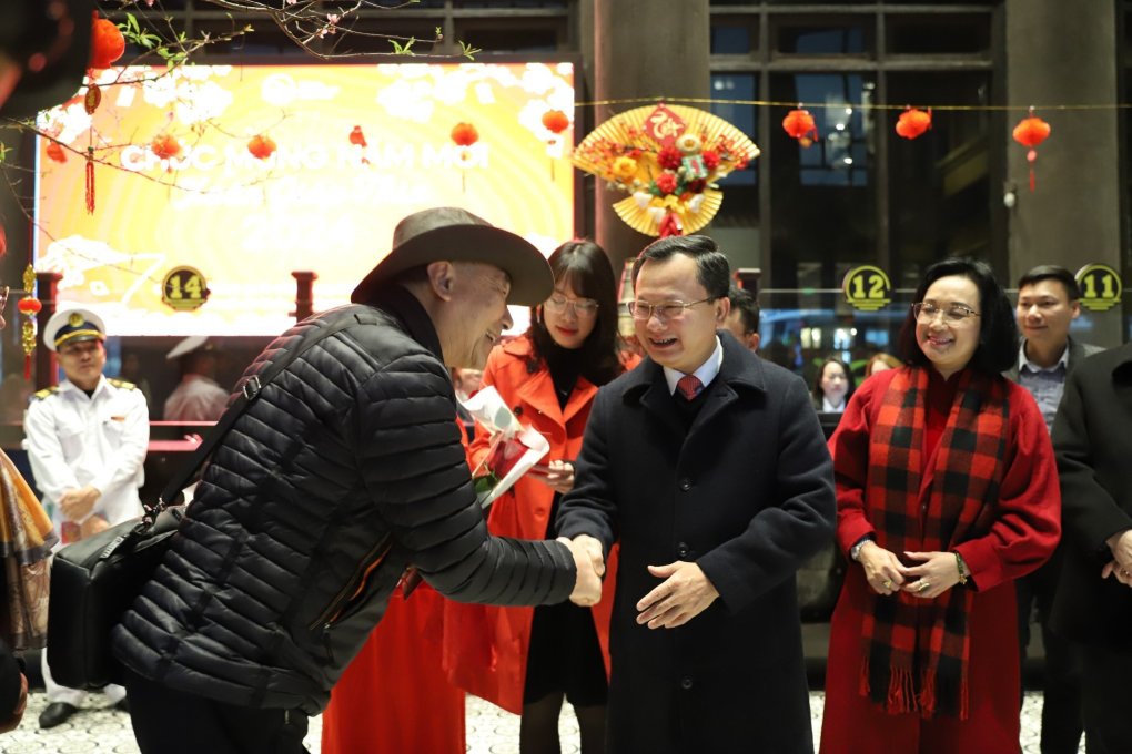 Ông Cao Tường Huy, Chủ tịch UBND tỉnh Quảng Ninh, đã ra Cảng tàu khách quốc tế Hạ Long trao tặng hoa và gửi lời chúc mừng năm mới đến các du khách.
