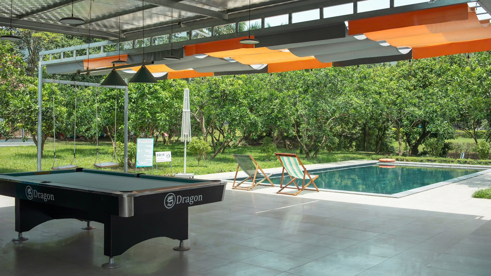 - Sảnh rộng để Bàn Bi-a view nhìn ra bể bơi, sân vườn.
