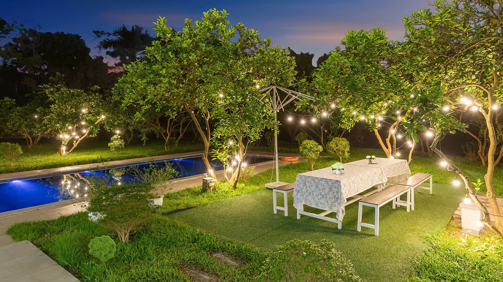 - Bể bơi giữa vườn (10mx5m, sâu 1.5m, có phần bể nông cho trẻ em 0.8m và có áo phao cho trẻ em), hệ thống lọc nước an toàn, đảm bảo sức khoẻ.