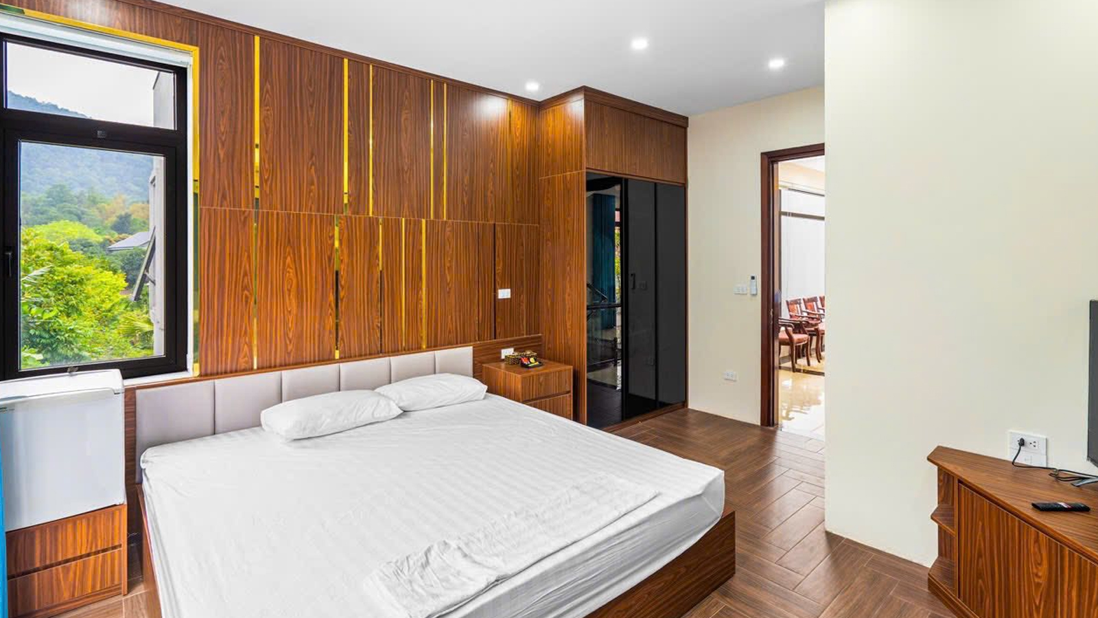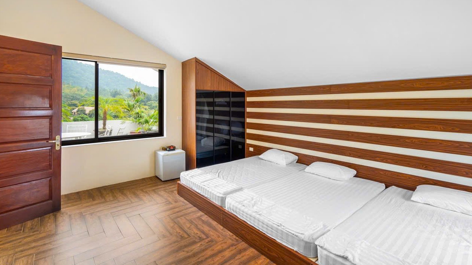 - Tầng 3 gồm 1 phòng ngủ thiết kế với 1 giường đôi khép kín, 1 phòng ngủ có 3 giường 1m4 gộp khép kín, Ngoài ra, tầng 3 có một ban công rất rộng phía ngoài, thông nhau bằng cầu kính lớn, có bàn ghế ngồi bên ngoài tại ban công.